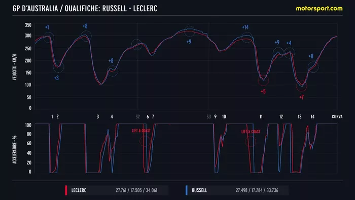 En la vuelta rápida se ha visto cómo, con los siete MJ concedidos por la Federación para reducir la necesidad de recurrir demasiado al lift and coast, se ha vuelto fundamental no solo la aportación del motor térmico, sino también la forma en que se utiliza y se recupera la energía. Este es el primer gran tema, porque en este aspecto Mercedes parece disfrutar por ahora de una ventaja sobre la competencia, sobre todo en pistas rápidas, con pocas frenadas y cuando se concede poca energía.